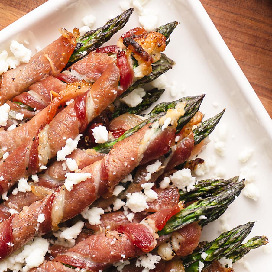 - Remove the baking sheet from the oven and, using a pair of tongs, stack the asparagus on a plate and sprinkle the crumbled feta cheese over the bacon-wrapped spears.