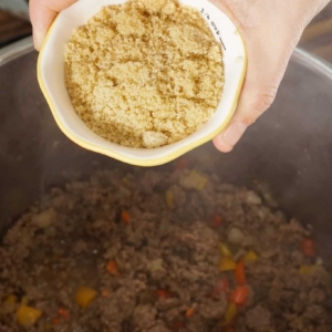 - Once the beef has browned, add the soy sauce, Worcestershire sauce and brown sugar and mix well.