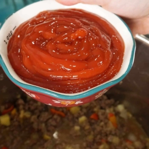 - Dump the cup of ketchup and the two tablespoons of tomato paste on top of the ground beef, but DO NOT MIX it in. Just let it sit on top.
