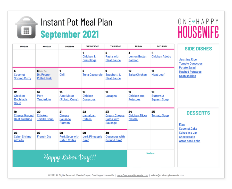 Below the list of recipes, you will find a link to the downloadable calendar and links to all my monthly Instant Pot meal plans.