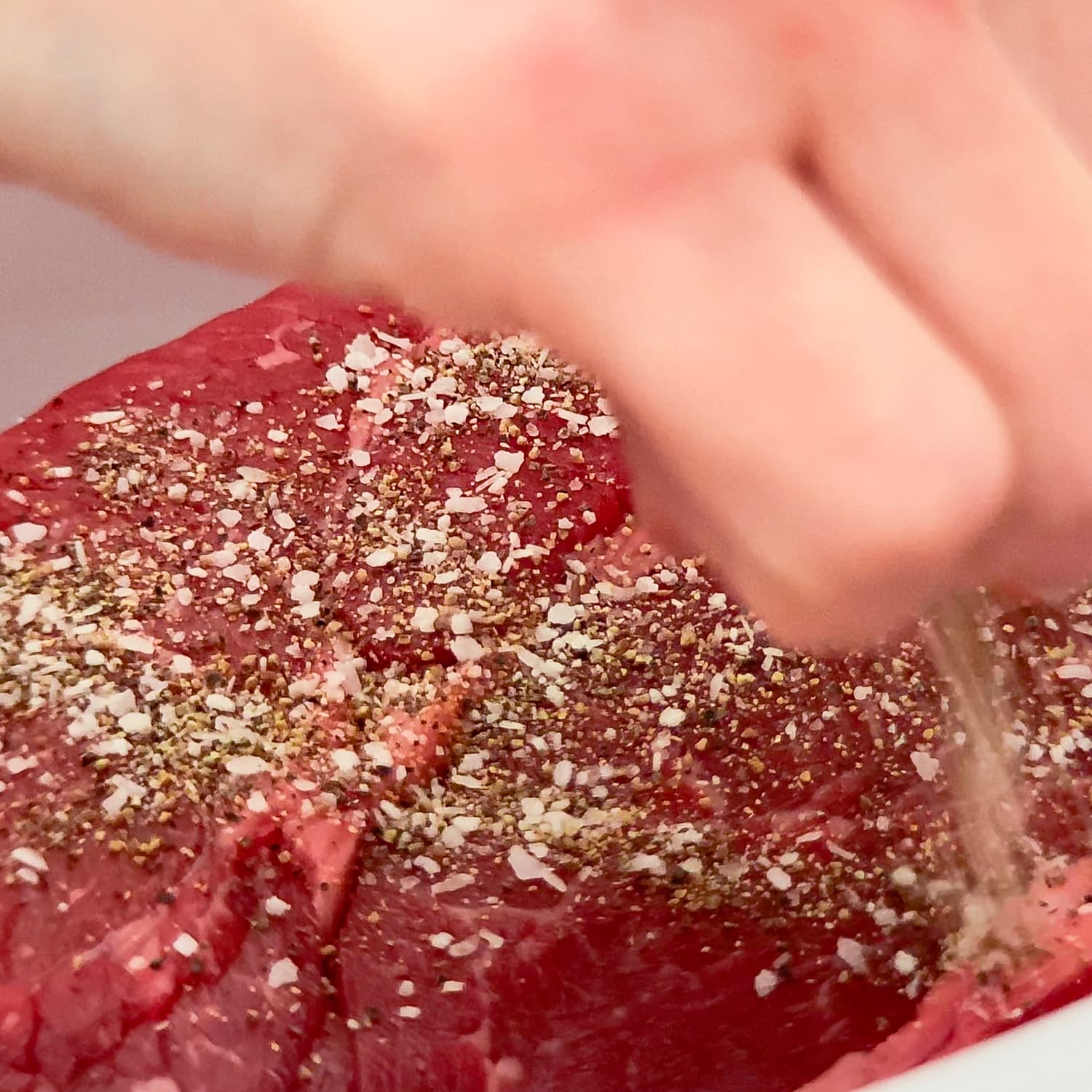 Mix the kosher salt, black pepper, and garlic powder together in a small bowl. Sprinkle the seasoning mix evenly over both sides of the roast. Then place the roast inside the slow cooker.
