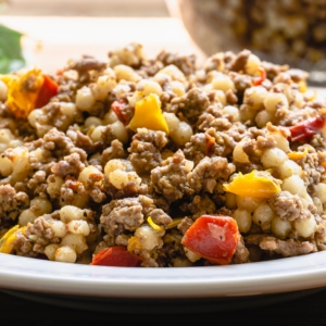 from One Happy HousewifeMade with Israeli couscous, seasoned ground sirloin, and sweet peppers, this quick and easy pasta dish is full of flavor and certain to become a family favorite. Perfect for busy weeknights!