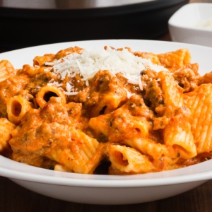 from One Happy HousewifeRigatoni pasta and savory ground sausage are covered in a cheesy marinara sauce. This is a quick, easy, and filling pasta dish that the entire family will love.
