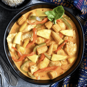from Spice CravingsA sweet and spicy Thai red curry with pieces of chicken, mango and veggies.